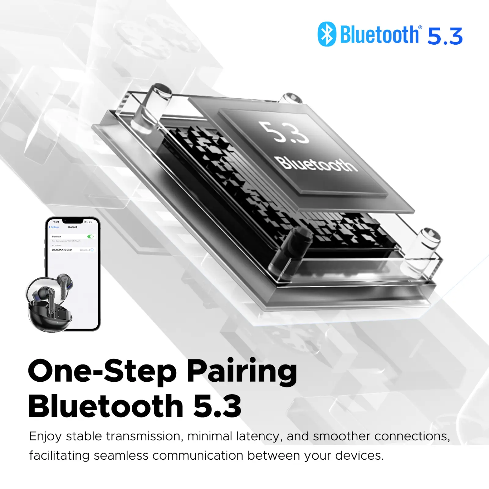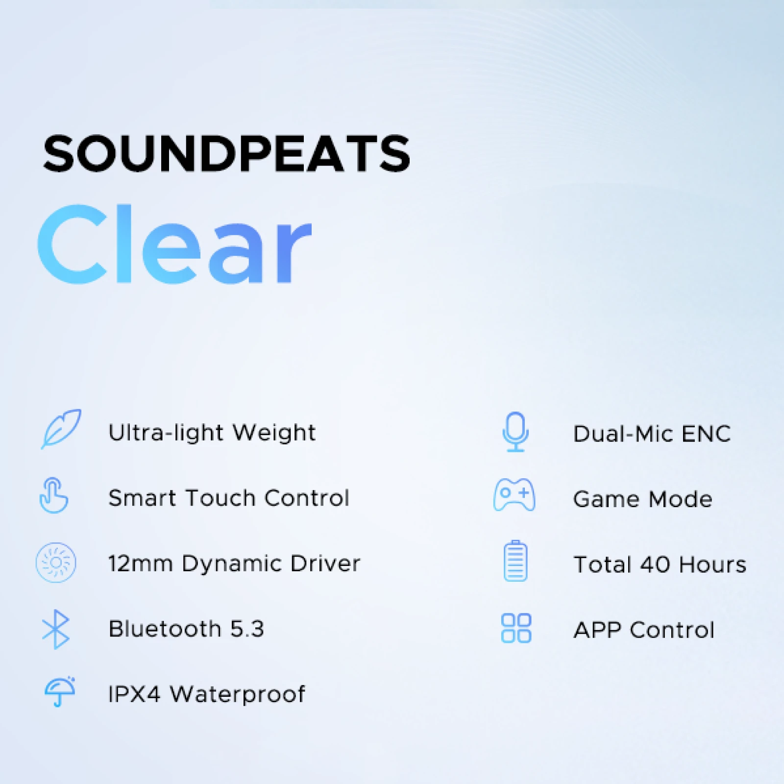 The SoundPEATS Clear Earbuds combine stylish transparent design with powerful audio performance at an affordable price. Featuring a 12mm dynamic driver, Bluetooth 5.3, and dual mic ENC, these earbuds deliver clear sound, stable connection, and smooth calling experience.